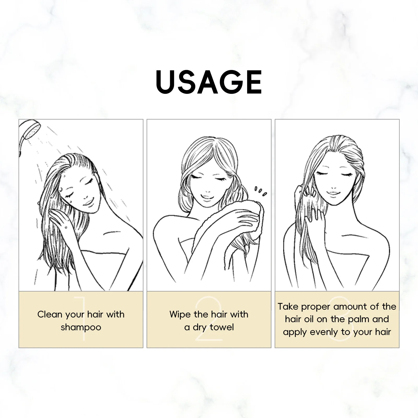 1.After shampooing and conditioner, start with a small amount in the palm of your hand and massage for 3-5 mins.