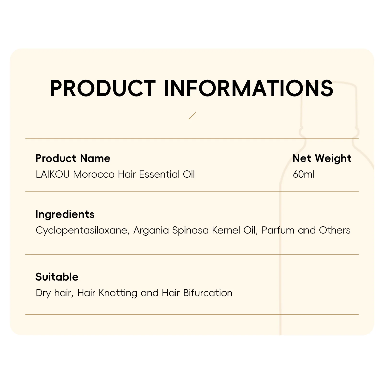 LAIKOU Morocco Hair Essential Argan Essence Oil Moisturizer Brightening Smooth Nourishing Repair Dry Damaged Hair 60ml
